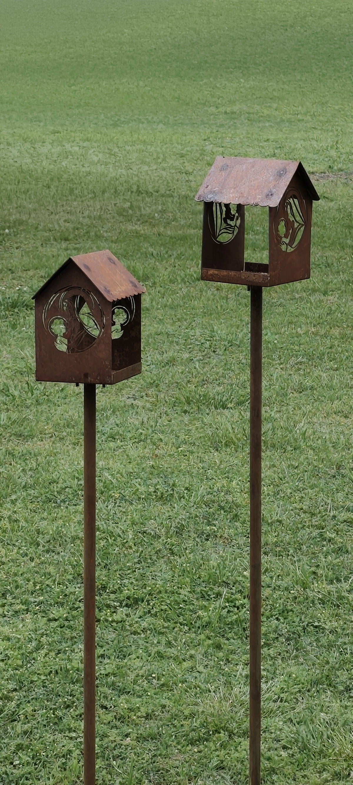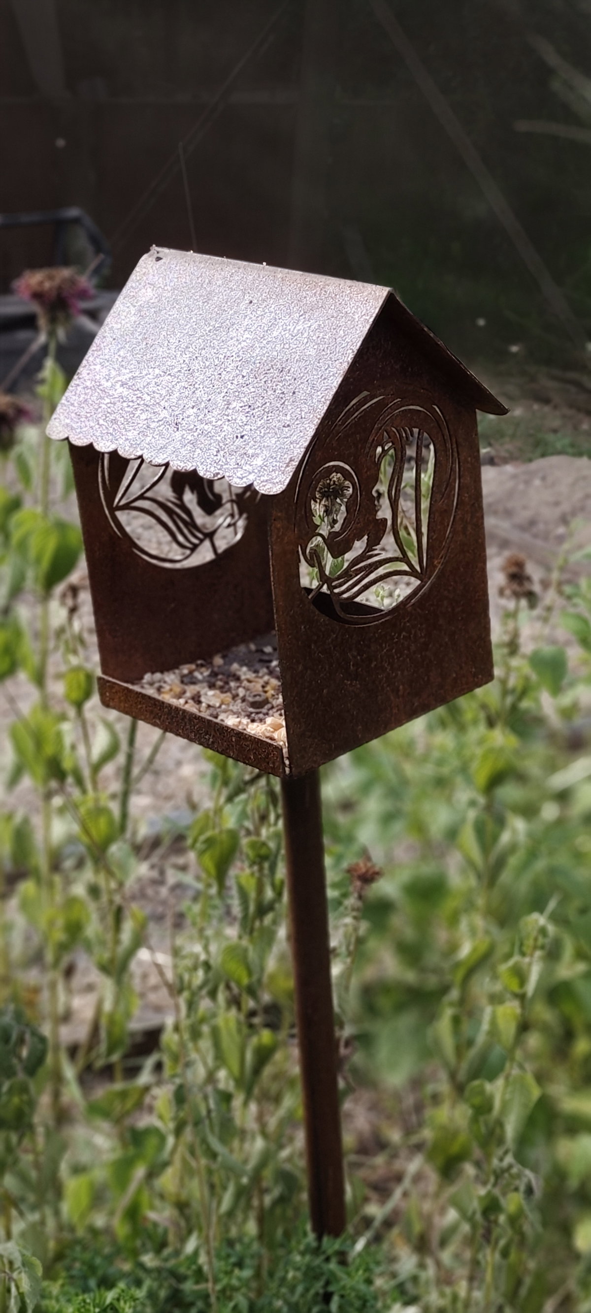 100% metal con pátina de oxido hidrolaqueado incluye pié para clavar en cualquier espacio de tu jardín o parque.