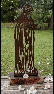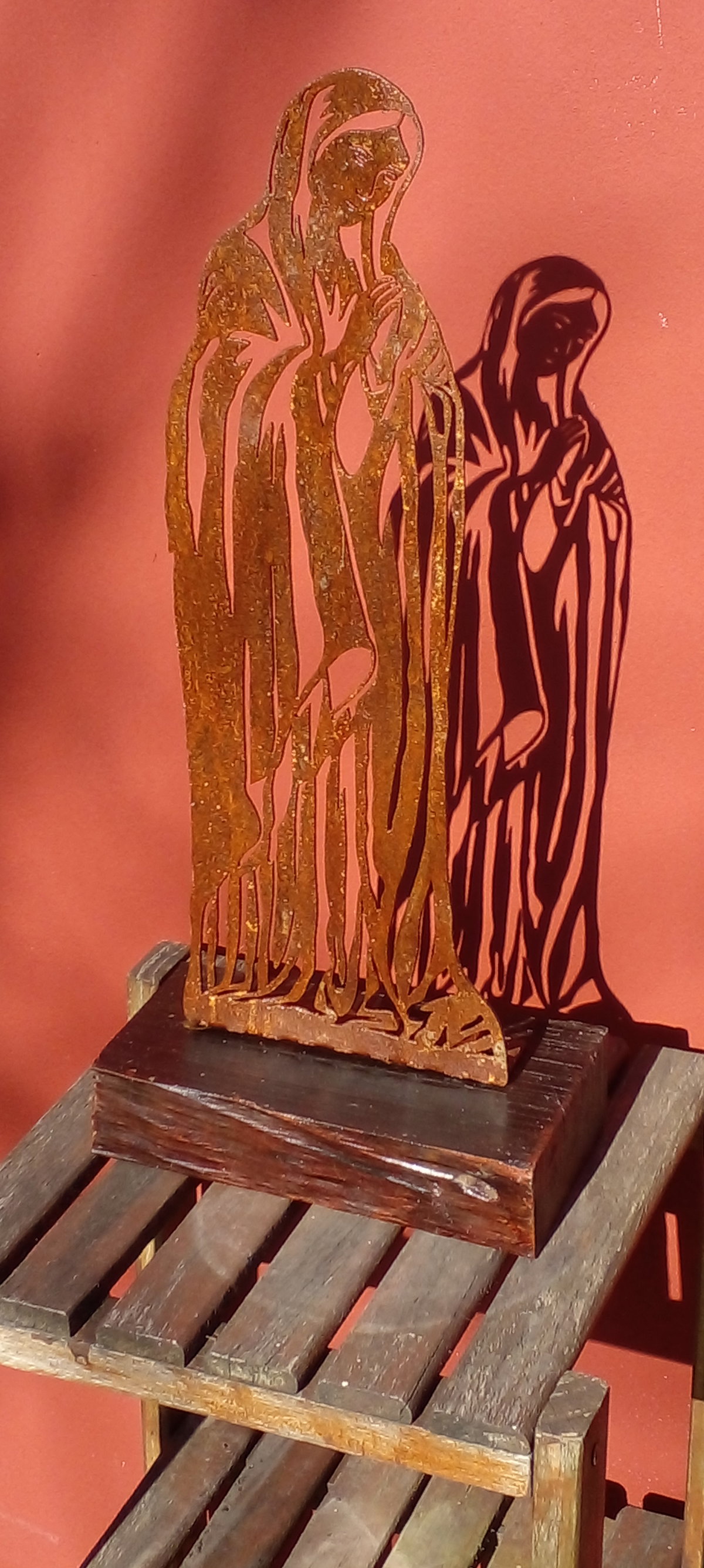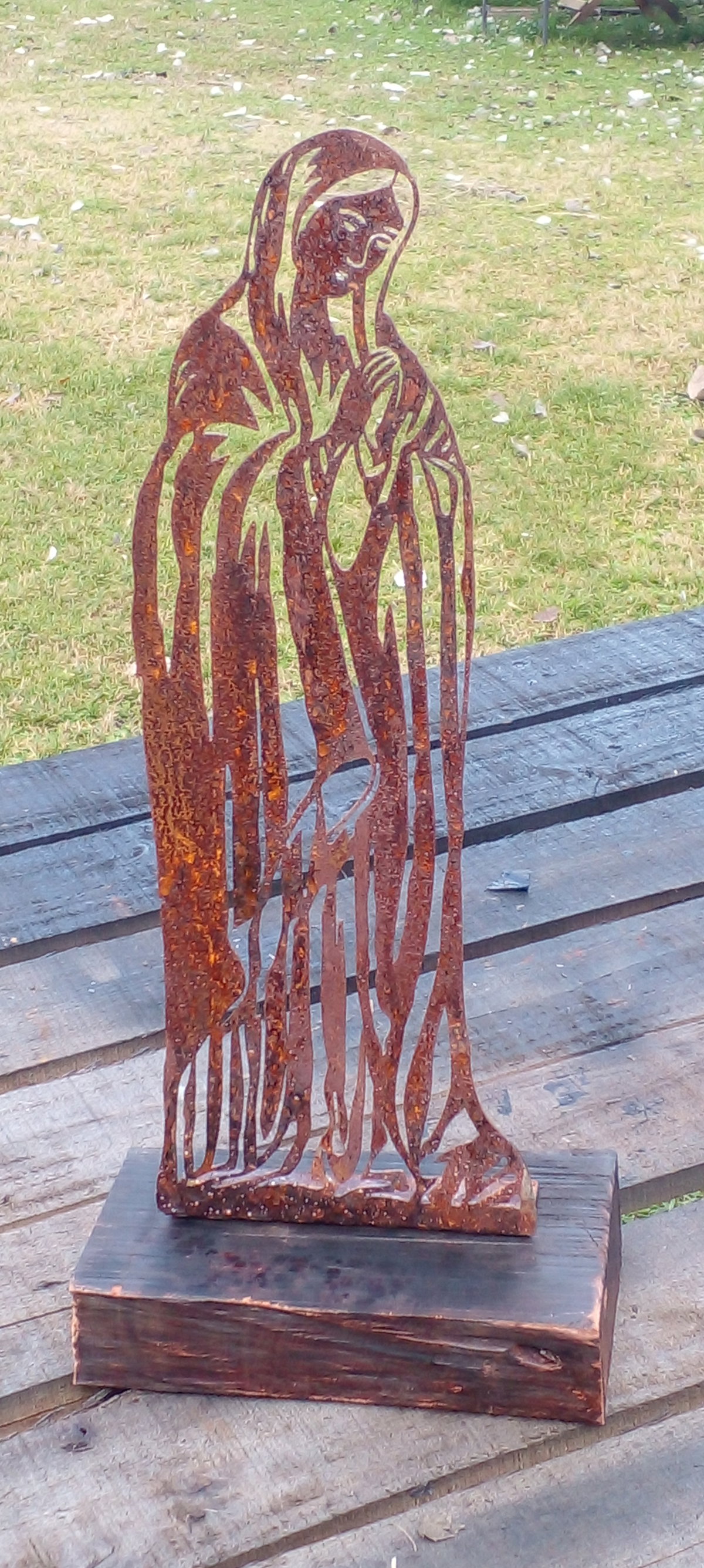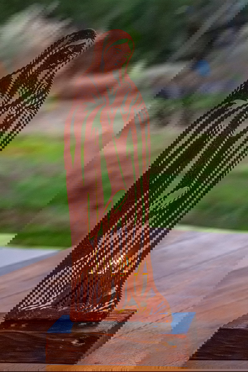 Virgen de hierro con pátina oxido y base de quebracho